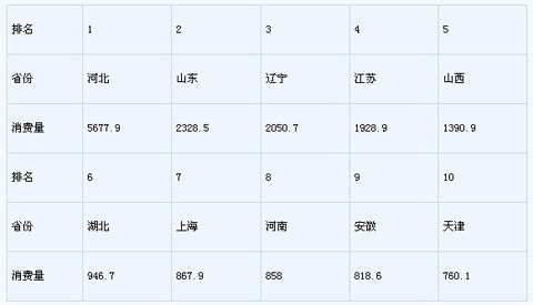 表3 2008年排名前10位省份焦炭消費量 (單位:萬噸)