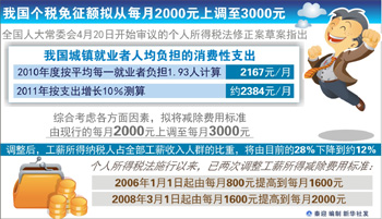 謝旭人表示,草案擬將減除費(fèi)用標(biāo)準(zhǔn)由現(xiàn)行的每月2000元上調(diào)至每月3000元,調(diào)整后,工薪所得納稅人占全部工薪收入人群的比重,將由目前的28%下降到12%左右。