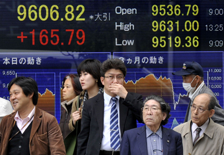 4月20日,在日本首都東京,行人從股價(jià)顯示牌前走過(guò)。 受隔夜紐約股市上漲及投資者對(duì)上市公司業(yè)績(jī)持樂(lè)觀期待等因素影響,當(dāng)日東京股市日經(jīng)225種股票價(jià)格指數(shù)上漲1.76%。