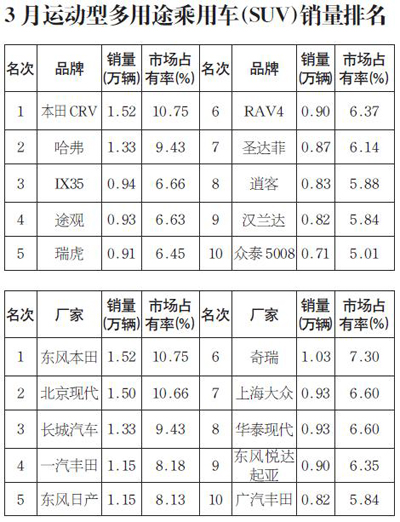 3月銷量排名前10位的SUV企業(yè)共銷售11.25萬輛,占SUV銷售總量的80%。與上月相比,排名前10位的SUV企業(yè)中,排名上升的有:東風(fēng)本田上升四位,一汽豐田、奇瑞上升三位,北京現(xiàn)代、東風(fēng)日產(chǎn)上升一位;排名下降的有:上海大眾下降六位,華泰現(xiàn)代下降四位,長城汽車、東風(fēng)悅達(dá)起亞下降一位,廣汽豐田新進(jìn)前十,眾泰汽車跌出前十。