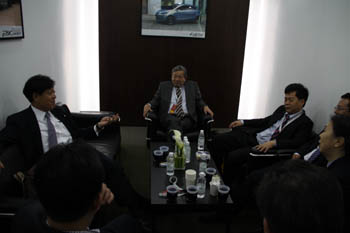 上海國際車展上,華菱重卡董事長劉漢如(右一)和三菱自動車工業(yè)株式會社社長益子修(左一)會晤,尋求合作機會和未來共同發(fā)展空間。陳曉/攝 |