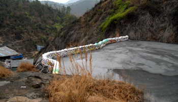 鋁灰廠懸在半山腰的污水庫臟臭不堪。記者 劉大江/攝 |
