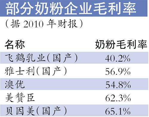 據(jù)調(diào)研公司Euromonitor的統(tǒng)計(jì),上述6大“洋奶粉”在國內(nèi)奶粉市場份額約為40.1%!把竽谭邸钡拿适欠裼痔貏e高呢?本報(bào)翻查上市公司年報(bào)發(fā)現(xiàn),嬰幼兒奶粉尤其是高端奶粉毛利率普遍較高,國產(chǎn)品牌如貝因美毛利率更站上65.1%,甚至高過一些“洋奶粉”。