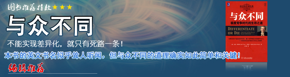 | 在這個極度競爭的世界中,在全球經(jīng)濟深刻劇變的年代中,誰敢保證自己的企業(yè)能生存下來,甚至活得更好?本書的英文書名似乎聳人聽聞,但與眾不同的道理確實如此簡單和關鍵。本書將幫助困境中的企業(yè),通過許多生動的故事,包括來自中國的案例,講解實施差異化的方法。用特勞特先生對中國企業(yè)的話來講:如果你的產(chǎn)品是差異化的,整個世界就會為你敞開大門。