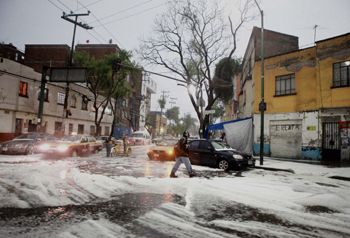 4月16日,在墨西哥首都墨西哥城,市民走過被冰雹覆蓋的街道。 墨西哥城當(dāng)天下起大雨,部分地區(qū)出現(xiàn)冰雹,一些道路通行受阻。新華社發(fā) |