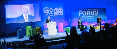 5月24日,在法國(guó)首都巴黎,歐洲理事會(huì)主席范龍佩(左)在經(jīng)合組織50周年論壇和部長(zhǎng)會(huì)議開幕式上講話。 為期三天的經(jīng)合組織50周年論壇和部長(zhǎng)會(huì)議當(dāng)日在巴黎召開。經(jīng)合組織秘書長(zhǎng)安赫爾·古里亞表示,今天的經(jīng)合組織不是一個(gè)智庫(kù),而是一個(gè)“為最優(yōu)生活而促進(jìn)并實(shí)踐最優(yōu)政策”的政府間組織。