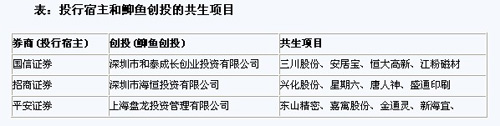 券商投行部門與創(chuàng)投機構之間形成“宿主”與“印魚”關系的,以國信證券、招商證券和平安證券為代表,而這三家券商共同的特點是,在創(chuàng)業(yè)板和中小板擴容大潮中占據了相當?shù)腎PO保薦項目市場份額。