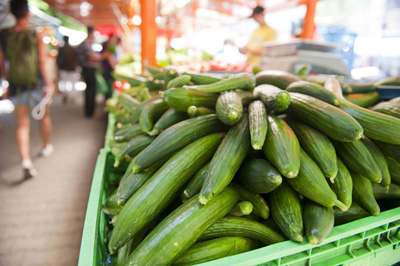5月31日,在德國首都柏林的一個露天市場,商販銷售黃瓜。