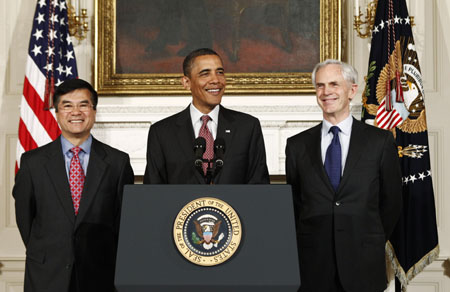 5月31日,在美國(guó)首都華盛頓的白宮,美國(guó)總統(tǒng)奧巴馬(中)宣布提名企業(yè)家約翰·布賴森(右)出任美國(guó)商務(wù)部長(zhǎng),接替即將轉(zhuǎn)任駐華大使的駱家輝(左)。