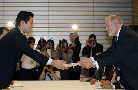6月1日,在位于日本東京的首相官邸,國際原子能機構(gòu)調(diào)查團團長韋特曼(右)向日本首相輔佐官細野豪志遞交調(diào)查報告概要。 調(diào)查團5月23日抵達日本,檢查了日本原子能發(fā)電公司位于茨城縣的東海第二核電站和東京電力公司經(jīng)營的福島第一核電站。調(diào)查團將在國際原子能機構(gòu)6月20日至24日在維也納舉行的核安全部長級會議上匯報詳細調(diào)查結(jié)果。