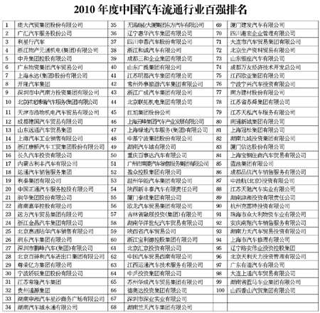 5月30日,中國汽車流通協(xié)會對外正式發(fā)布了2010年度中國汽車經(jīng)銷商集團百強排行榜,龐大汽貿(mào)股份有限公司等100家汽車銷售企業(yè)榜上有名。