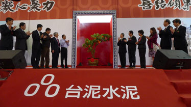 | 圖為:臺泥安順一期竣工慶典儀式上,眾領導嘉賓與臺泥董事長辜成允等高層共同“喜迎碩果”。 |