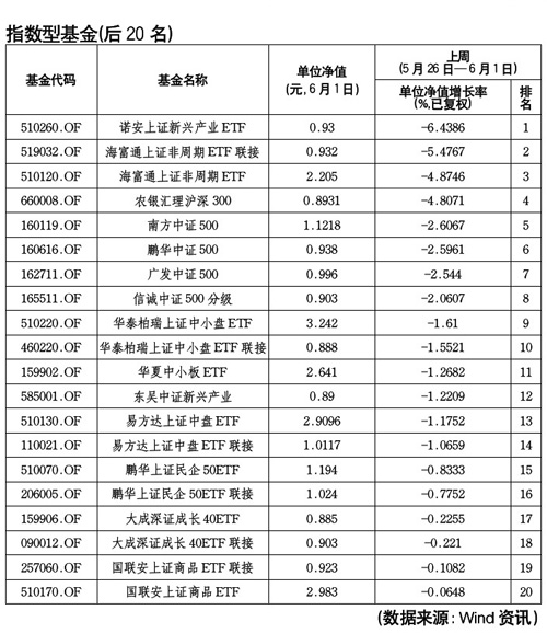 諾安基金管理有限公司旗下的,2011年4月成立的諾安上證新興產(chǎn)業(yè)以-6.44%的凈值增長率成為本周(5月26日-6月1日)指數(shù)型基金收益倒數(shù)第一,其今年以來年漲幅為-7.7%。