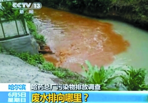 哈爾濱城區(qū)有條河溝流經(jīng)哈藥總廠,記者發(fā)現(xiàn),河水在進(jìn)入這個(gè)廠區(qū)之前是青白色的,但從廠區(qū)流出就變成土黃色,散發(fā)著非常刺鼻的臭味。記者在廠區(qū)深處順著河溝尋找,發(fā)現(xiàn)了藥廠污水排放口。排污口散發(fā)著惡臭,水是黃色的。