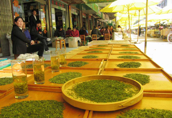 峨橋茶市始自明末清初,歷史悠久,素有“江南第一茶市”美譽(yù)。峨橋人更是以“買全國茶,賣全國茶”聞名。記者走進(jìn)寫有“江南第一茶市”的高大的仿古門樓,只見前面茶市一排排大黃油布傘密密麻麻,一眼望不到頭。大黃傘下,人頭攢動,熙熙攘攘,買茶的人群絡(luò)繹不絕,品茶的、論茶的、談價的、包裝的……茶市一片熱鬧繁忙景象。