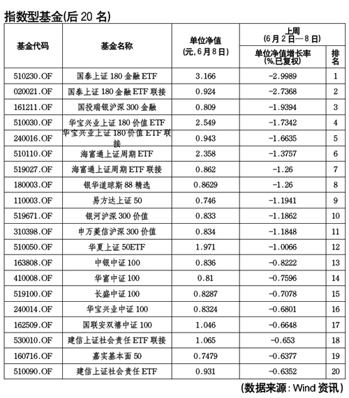 國泰基金管理有限公司旗下的,2011年3月成立的國泰上證180金融ETF以-3.0%的凈值增長率成為本周(6月2日-8日)指數(shù)型基金收益倒數(shù)第一,其今年以來年漲幅為-11.4%。