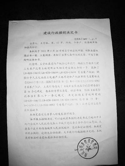 海城市城建局發(fā)給王守林的《建設(shè)行政撤銷(xiāo)決定書(shū)》。王晨