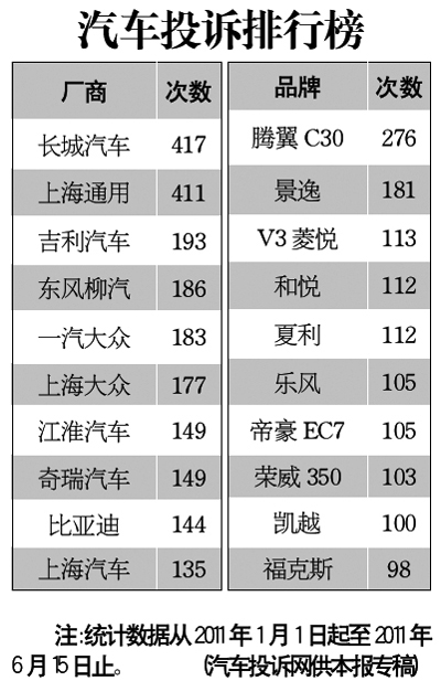汽車投訴排行榜[2011-06-16]