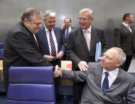 6月19日,剛剛在內(nèi)閣改組中上任的希臘財政部長韋尼澤洛斯(前左)在盧森堡出席歐元區(qū)財長會議時與德國財長朔伊布勒(前右)握手。 歐元區(qū)財長19日晚間在盧森堡開始召開會議討論希臘問題。在20日凌晨發(fā)表的一份聲明中,17國財長表示,希臘2012年返回市場融資無望,因此有必要對希臘進行新一輪援助,并歡迎私人投資者在自愿基礎(chǔ)上參與新的救助。歐元區(qū)將在7月初確定新一輪救助方案主要內(nèi)容。