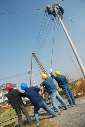 余杭供電局大力開展新農村電氣化建設,讓農民與居民享受一樣的用電待遇。圖為余杭供電所農電班的員工們正在為新豎起的電桿拉線。姚學恒