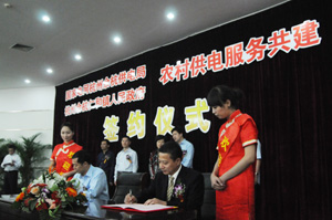余杭供電局局長童鈞(左)與仁和鎮(zhèn)簽訂《農村供電服務共建協(xié)議》。姚學恒