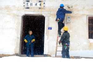 電力共建后大大提升特殊時期偏遠山區(qū)的電力搶修速度。圖為年初冰雪天氣中,村電工修復高山村民的生活用電設施。姚學恒