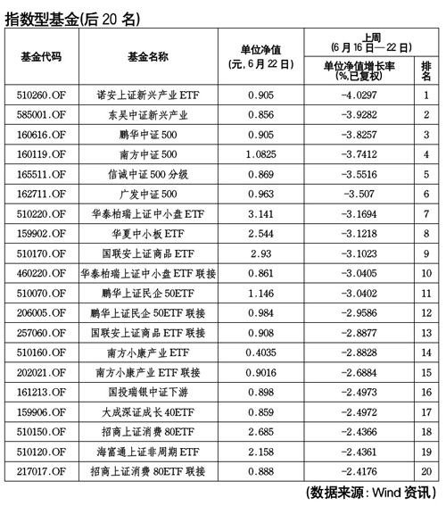 諾安基金管理有限公司旗下的,2011年4月成立的諾安上證新興產(chǎn)業(yè)ETF以-4.03%的凈值增長(zhǎng)率成為本周(6月16日-22日)指數(shù)型基金收益倒數(shù)第一,其今年以來(lái)年漲幅為-7.8%。