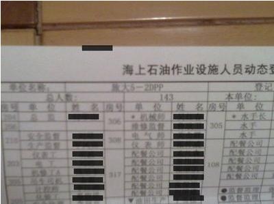 如果按照這張圖片顯示的住宿名單來(lái)看,這個(gè)海上平臺(tái)無(wú)疑存在超員的現(xiàn)象,該網(wǎng)友稱(chēng),“一個(gè)有2艘救生艇的平臺(tái),一共可以乘坐120人,怎么有143人在平臺(tái)上”。他表示,如果海面發(fā)生漏油火災(zāi),那么剩下的23個(gè)人將得不到有效救援。他說(shuō),如果剩下的23人不乘坐救生艇,而是乘坐非密閉的救生筏,那么在海面有火有毒的環(huán)境下,這些人的性命堪憂(yōu)。