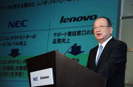 7月4日,在日本東京舉行的新聞發(fā)布會(huì)上,聯(lián)想NEC控股公司(Lenovo NEC Holdings B.V.)總裁高須英世講話。