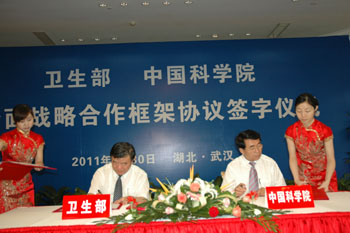 衛(wèi)生部和中科院日前在湖北武漢簽署全面戰(zhàn)略合作框架協(xié)議,雙方依托各自優(yōu)勢(shì)機(jī)構(gòu)和資源,攜手開展人口健康和生物醫(yī)藥發(fā)展戰(zhàn)略研究,共同推動(dòng)我國醫(yī)藥科技事業(yè)發(fā)展。圖為衛(wèi)生部部長(zhǎng)陳竺和中科院院長(zhǎng)白春禮代表雙方在協(xié)議上簽字。新華社記者