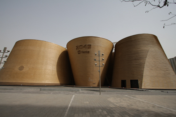 圖為位于上海世博園區(qū)內的萬科館。由于建筑外墻面使用了秸稈板,萬科館宛如金燦燦的麥垛矗立在浦江西畔。 |