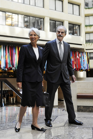 朱民被提名,并未改變IMF格局。圖為IMF第一副總裁約翰·利普斯基(右)歡迎新總裁克里斯蒂娜·拉加德。記者 張軍