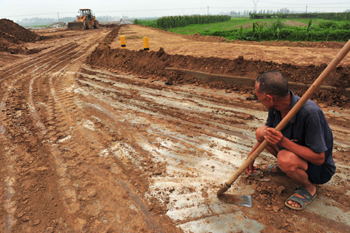 村民吳小先家也被修路占了一畝多地,他用鋤頭一邊將尚未搬走的土刨開,露出下面的水泥地,一邊用手撕掉一塊塊露在外面的薄膜,心疼地對記者說:“這樣的地里也能長出菜來,誰相信!這不是糟蹋老百姓的錢嗎?這些薄膜難道花的不是老百姓的錢?”