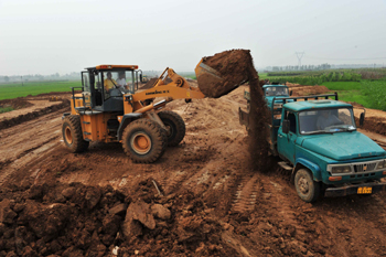 一輛裝載機(jī)在湖北省襄陽市襄州區(qū)雙溝工業(yè)園9號路上向卡車上裝土,以便運(yùn)走。記者 杜華舉
