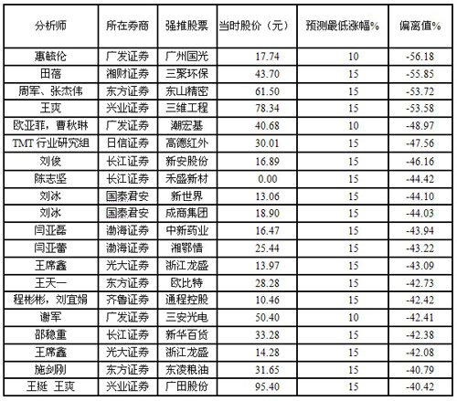 中國不信任分析師排行榜第四名:興業(yè)證券王爽 作為研究贛粵高速分析師之一的王爽,連續(xù)三個月對其出具四份研報,而評級卻都是強烈推薦已經(jīng)引起眾多網(wǎng)友的的連番炮轟。 從2010年11月開始,王爽發(fā)布了4次對三維工程的強烈推薦,第一次推薦后,三維工程股價上漲至92.5的最高點,然而伴隨著后面三次的強烈推薦都是股價的猛烈下跌。從第一次強烈推薦到第四次強烈推薦期間,三維工程股價卻下跌了18.4%。 中國不信任分析師排行榜季軍:東方證券周軍、張杰偉 周軍、張杰偉兩人雙劍合一卻也無法正確預(yù)估東山精密股價,在《入股SolFocus,開拓中國CPV市場》研報中,給予東山精密“買入”評級,但與實際股價走勢相差甚遠。在預(yù)測去年的12個月內(nèi),東山精密在2010年12月達到了目標股價,但此后如前文所述一樣狂瀉不止。然而此時卻不見分析師的一份研究報告,從研報發(fā)布至今東山精密已下跌超過40%。 中國不信任分析師排行榜亞軍:湘財證券田蓓 對于三聚環(huán)保湘財證券的田蓓在2010年8月16日出具了唯一一份強烈推薦研報,截止至2011年7月5日,三聚環(huán)保最大的漲幅達到了田蓓預(yù)測的15%以上,然而在研報預(yù)測的區(qū)間內(nèi),三聚環(huán)保達到目標價后田蓓并未發(fā)出相關(guān)研報提示風(fēng)險或者做出相應(yīng)點評,從其發(fā)布研報至今已相對大盤下跌超40%。 中國不信任分析師排行榜冠軍:廣發(fā)證券惠毓倫 在去年8月27日對廣州國光出具研報給予買入評級,目標價20元,而一個月之后廣州國光即上漲到21.85元的區(qū)間高點,惠毓倫的精準判斷得到印證。然而接下來惠毓倫給予了廣州國光持有的評級,但高點后的廣州國光卻一瀉千里,研報發(fā)布至今完整區(qū)間內(nèi)實際相對大盤漲跌幅與預(yù)測漲跌幅相差幅度居然高達-56.18%。(經(jīng)濟參考網(wǎng)綜合中國證券報、法制網(wǎng)、上海證券報、信息時報、理財周報、新浪財經(jīng)、證券時報等媒體報道)