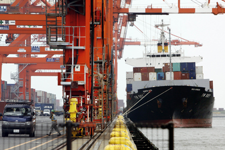 21日,在日本東京港口,集裝箱被運(yùn)上貨船。 日本財務(wù)省21日公布的貿(mào)易統(tǒng)計(jì)速報顯示,隨著出口回升,日本6月份出現(xiàn)707億日元(約合9億美元)貿(mào)易順差,為三個月來首次出現(xiàn)貿(mào)易順差。日本財務(wù)省同日發(fā)布的統(tǒng)計(jì)數(shù)據(jù)還顯示,受震災(zāi)影響,今年上半年,日本出現(xiàn)8955億日元(約合114億美元)貿(mào)易逆差。