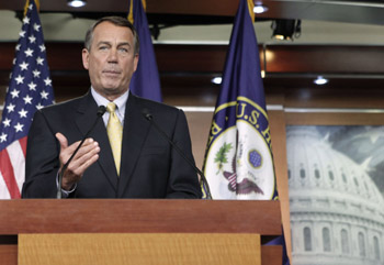 7月22日,在美國華盛頓國會山,美國眾議院議長約翰·博納就債務(wù)限額問題發(fā)表講話。 博納在稍后的記者會上批評奧巴馬,稱后者要求將未來10年額外增稅4000億美元,且拒絕增加社保開支削減規(guī)模,要為這輪談判告吹負責(zé)。新華社/路透 |
