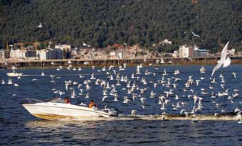 滇池沿湖生態(tài)修復(fù)工程初見(jiàn)成效。一群紅嘴鷗在昆明滇池草海上自由飛翔。記者