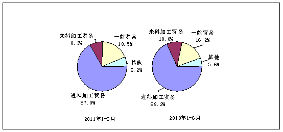 2011年與2010年上半年電子信息產(chǎn)品出口貿(mào)易方式結(jié)構(gòu)對(duì)比 |