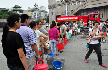 7月27日,綿陽市民在綿陽消防支隊送水點排隊打水。新華社發(fā)(王二來/攝) |