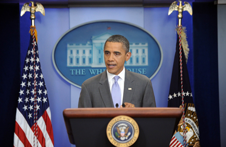 7月31日,在美國華盛頓白宮,奧巴馬在記者會上宣布美國國會兩黨已就提高債務(wù)上限達(dá)成一致。 分析認(rèn)為,如果這份協(xié)議未來幾天在國會兩院順利獲得通過,備受全球關(guān)注的美國債務(wù)違約警報(bào)將暫時(shí)得以解除,但美國長期債務(wù)形勢依然嚴(yán)峻。