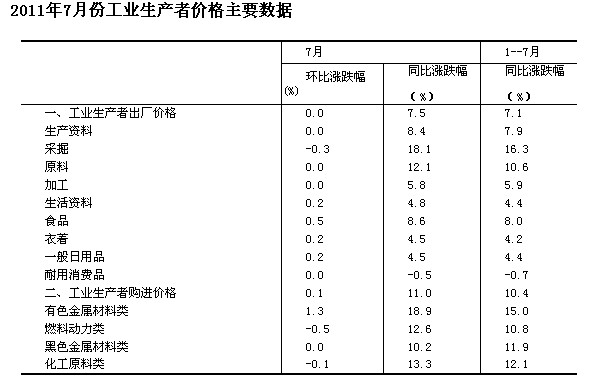 2011年7月份,全國工業(yè)生產(chǎn)者出廠價格與上月持平,比去年同月上漲7.5%。工業(yè)生產(chǎn)者購進(jìn)價格比上月上漲0.1%,比去年同月上漲11.0%。