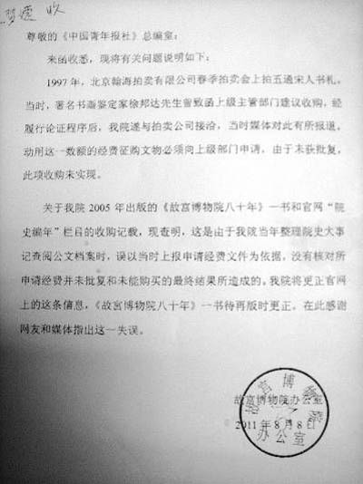 連日來,面對“私自拍賣館藏五件宋代書札”的質(zhì)疑,故宮博物院方面均予堅決否認(rèn)。8月5日,故宮新聞發(fā)言人馮乃恩正式向各媒體表示:“故宮博物院從未競買、收藏過網(wǎng)帖中所稱的5件北宋名人書札,更不存在私自拍賣藏品一說。”該說法與此前故宮博物院公共關(guān)系科,給予中國青年報的答復(fù)相一致。 但是,故宮博物院官方主頁的“院史編年”一欄中卻明確顯示,1998年有“收購宋人書札5件”入藏。其官方出版物《故宮博物院八十年》一書中第177頁“故宮博物院大事記”欄目下,“1997年”一欄中也明確記載:“6月18日,從瀚海拍賣公司拍得宋人書札五件! 對這一相互矛盾的信息,故宮博物院致函中國青年報,對其官方網(wǎng)站及出版物中的“購入記錄”作出回應(yīng)。 該回應(yīng)稱,故宮博物院曾就收購富弼《兒子帖》等五件宋人書札,而與拍賣公司接洽,但在向上級部門申請時,經(jīng)費未獲批復(fù),因此收購實際上未能實現(xiàn)。 至于兩項購入記錄,故宮博物院稱系因當(dāng)年整理公文檔案時,沒有核對最終結(jié)果所致,“我院將更正官網(wǎng)上的這條信息,《故宮博物院八十年》一書待再版時更正! 該函件主要內(nèi)容如下: 1997年,北京翰海拍賣有限公司春季拍賣會上拍五通宋人書札。當(dāng)時,著名書畫鑒定家徐邦達(dá)先生曾致函上級主管部門建議收購,經(jīng)履行論證程序后,我院遂與拍賣公司接洽,當(dāng)時媒體對此有所報道。動用這一數(shù)額的經(jīng)費征購文物必須向上級部門申請,由于未獲批復(fù),此項收購未實現(xiàn)。 關(guān)于我院2005年出版的《故宮博物院八十年》一書和官網(wǎng)“院史編年”欄目的收購記載,現(xiàn)查明,這是由于我院當(dāng)年整理院史大事記查閱公文檔案時,誤以當(dāng)時上報申請經(jīng)費文件為依據(jù),沒有核對所申請經(jīng)費并未批復(fù)和未能購買的最終結(jié)果所造成的。我院將更正官網(wǎng)上的這條信息,《故宮博物院八十年》一書待再版時更正。在此感謝網(wǎng)友和媒體指出這一失誤。 函件落款“故宮博物院辦公室”,時間為2011年8月8日。