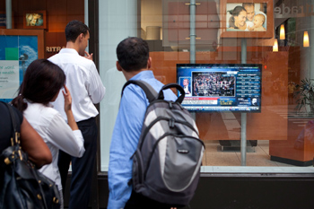 在美國紐約,幾名行人在街頭觀看美國眾議院投票通過提高美國債務(wù)上限和削減赤字法案的電視新聞報道。新華社/法新 |