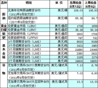 受標(biāo)準(zhǔn)普爾調(diào)低美國主權(quán)信用評級影響,當(dāng)周前兩個(gè)交易日多種大宗商品延續(xù)上周跌勢大幅下挫,隨著風(fēng)險(xiǎn)偏好的回升,多數(shù)品種觸底反彈,金價(jià)則走勢相反,在沖破每盎司1800美元后開始回調(diào)。