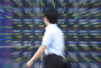 8月15日,在日本首都東京,一名行人從股市信息顯示屏前走過。 當(dāng)日,受上周末歐美股市反彈及亞洲股市15日普遍上揚等提振,東京股市日經(jīng)225種股票平均價格指數(shù)當(dāng)天上漲1.37%。截至收盤時,日經(jīng)股指比前一個交易日上漲122.69點,收于9086.41點。東京證券交易所股票價格指數(shù)上漲8.93點,收于777.12點,漲幅為1.16%。