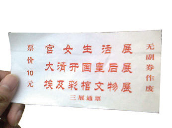 今天上午,記者趕到故宮南側(cè)的端門內(nèi),從端門往北至午門的路段兩側(cè),楊貴妃展、中國歷代皇后展、女皇武則天展等展廳達(dá)十余家。 展覽門票價格不等,主要分為5元和10元兩種,部分展廳聯(lián)合售票,如埃及文物彩棺展、大清開國皇后展、宮女生活展等三家展廳通票為10元。 但所謂門票,其實(shí)只是一張白底的紙,類似于手撕發(fā)票,上面印著展覽主題和票價。票面沒有任何公章,也沒有主管單位的落款。 針對記者提出的報銷問題,工作人員表示,“這是內(nèi)部票”,并掏出一張?zhí)彀查T城樓的票,稱可以拿回去報銷。