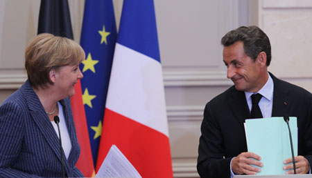 8月16日,法國總統(tǒng)薩科齊(右)與來訪的德國總理默克爾在總統(tǒng)府愛麗舍宮出席聯(lián)合記者招待會(huì)。