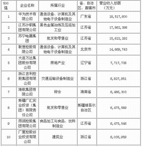 2010年中國(guó)民營(yíng)企業(yè)500強(qiáng)名錄日前在北京公布。華為技術(shù)有限公司、江蘇沙鋼集團(tuán)有限公司、蘇寧電器集團(tuán)位列前三名。雖然中國(guó)民營(yíng)經(jīng)過(guò)近些年的努力,取得了令人矚目的成績(jī),但是跟國(guó)有企業(yè)相比還是有很大的差距。中國(guó)經(jīng)濟(jì)網(wǎng)記者根據(jù)上月由《財(cái)富》雜志發(fā)布的《2011年中國(guó)500強(qiáng)》對(duì)比發(fā)現(xiàn),入圍前十強(qiáng)的中國(guó)民營(yíng)企業(yè)去年的營(yíng)業(yè)額總和加一起不抵位居中國(guó)500強(qiáng)企業(yè)榜首的中國(guó)石油化工股份有限公司(以下簡(jiǎn)稱(chēng)中石化)一家的營(yíng)業(yè)收入。
