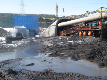 污水橫流的阜康氣煤有限公司二號(hào)井施工現(xiàn)場(chǎng)。記者 劉兵/攝 |